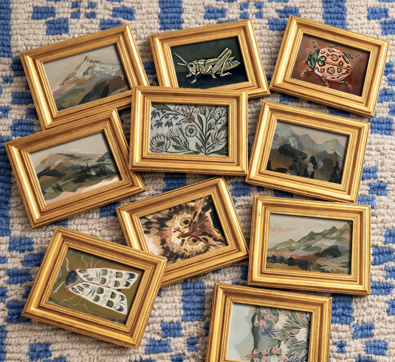 These miniature landscapes are inspired by the volcanic mountains and alpine lakes along Oregon’s Cascade Lakes Highway. Each painting is signed by hand and set in a gold-colored antique style frame. Subtle metallic accents are layered into the artwork to catch the light and echo the shimmer of high mountain lakes.