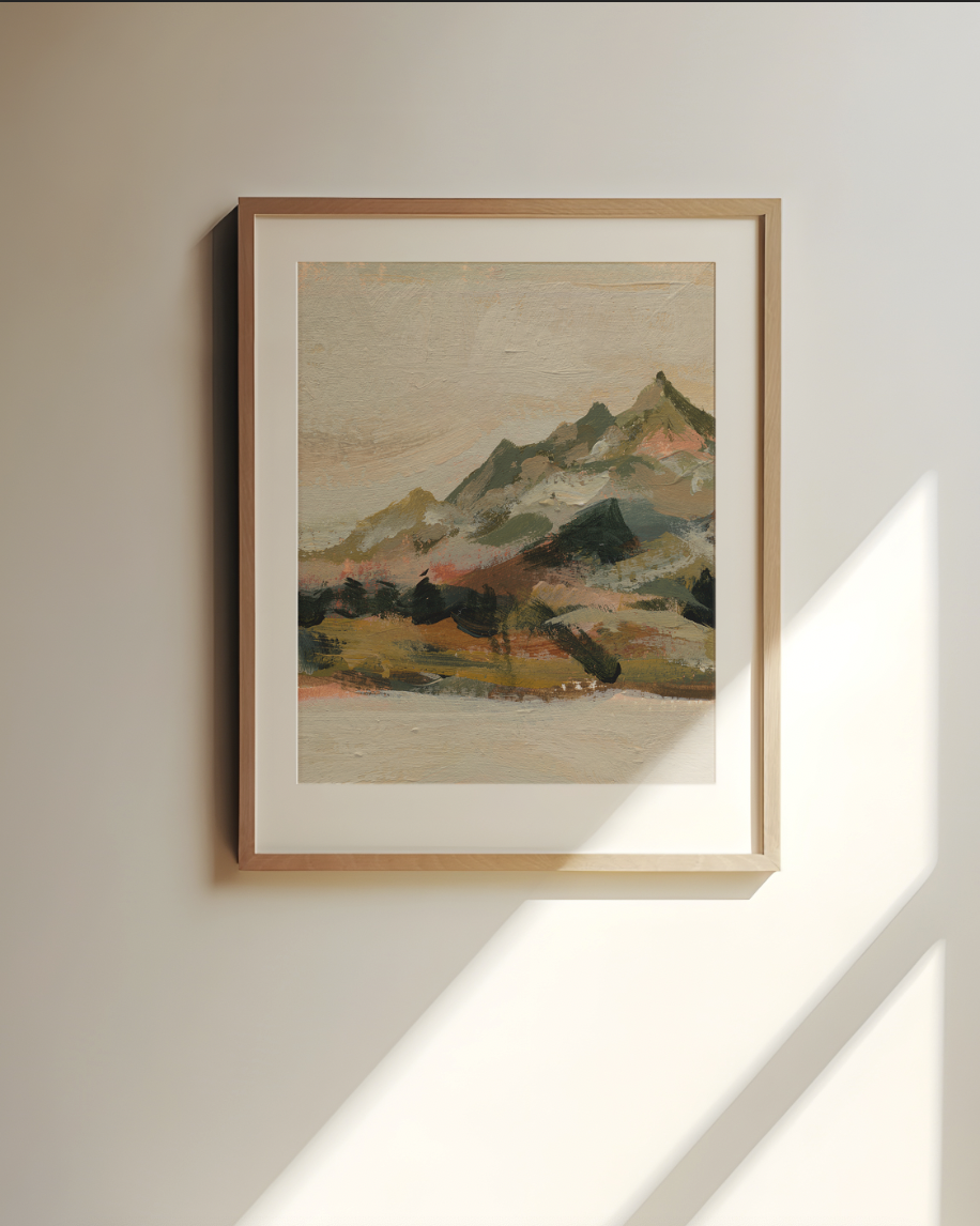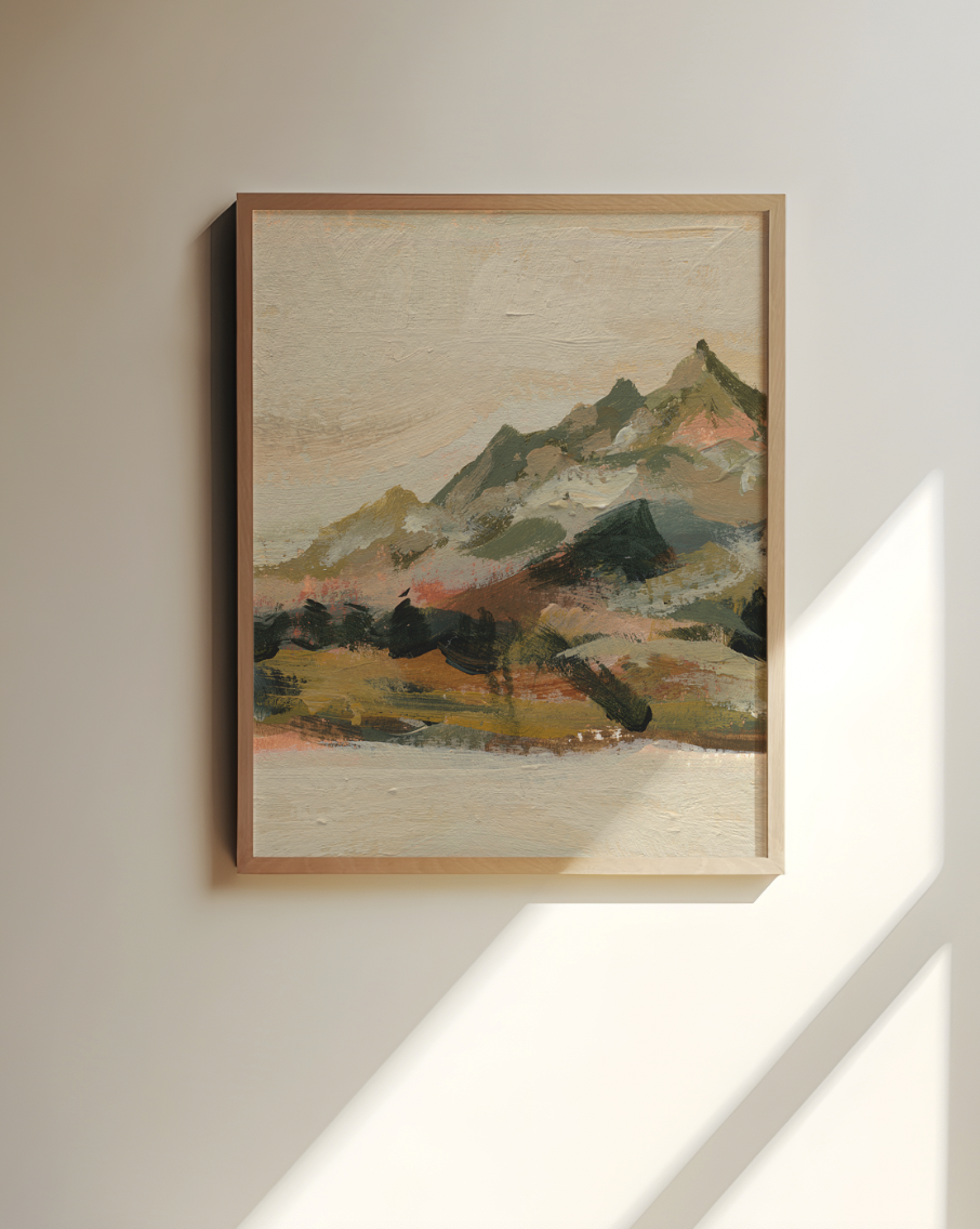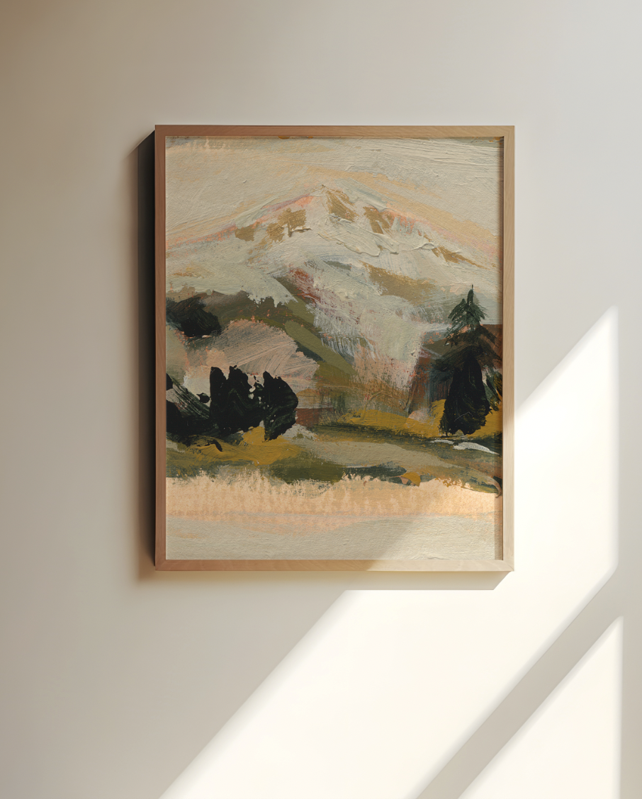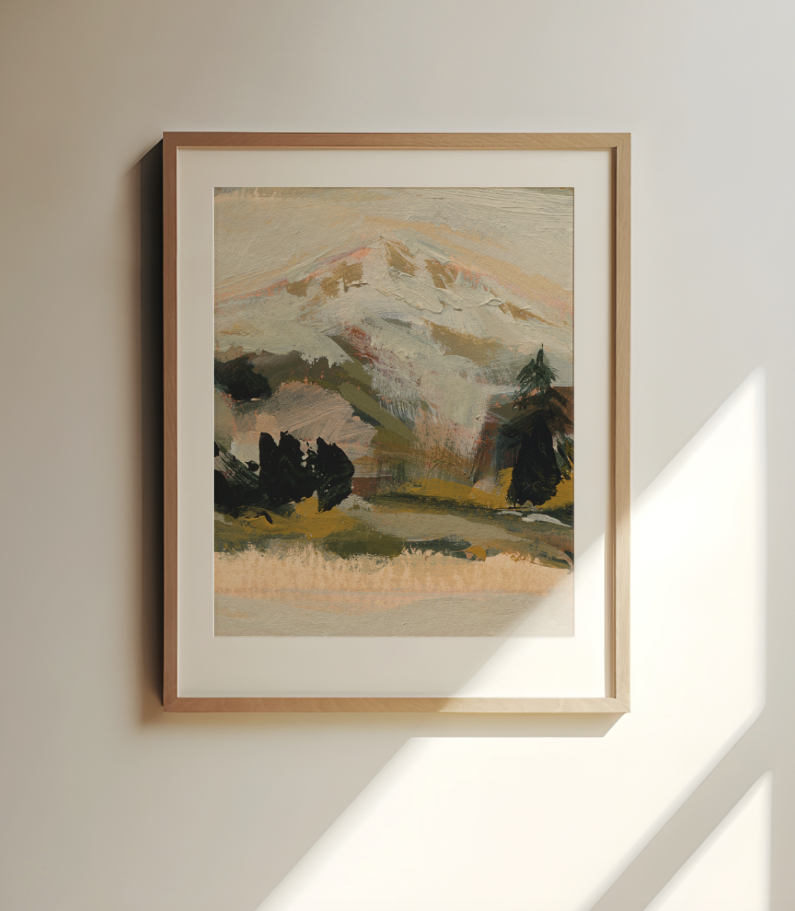 Inspired by the volcanic peaks and alpine lakes of the Cascade Lakes Highway in Central Oregon, where snow lingers in the shadows and still water reflects the sky. Bold brush strokes and cozy colors define this collection. Frames shown are for inspiration only.